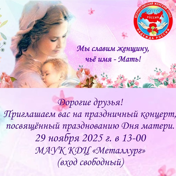 Приглашаем вас на праздничный концерт, посвящённый самому тёплому и светлому празднику — Дню Матери. «Мы славим женщину, чьё имя — Мать!»
