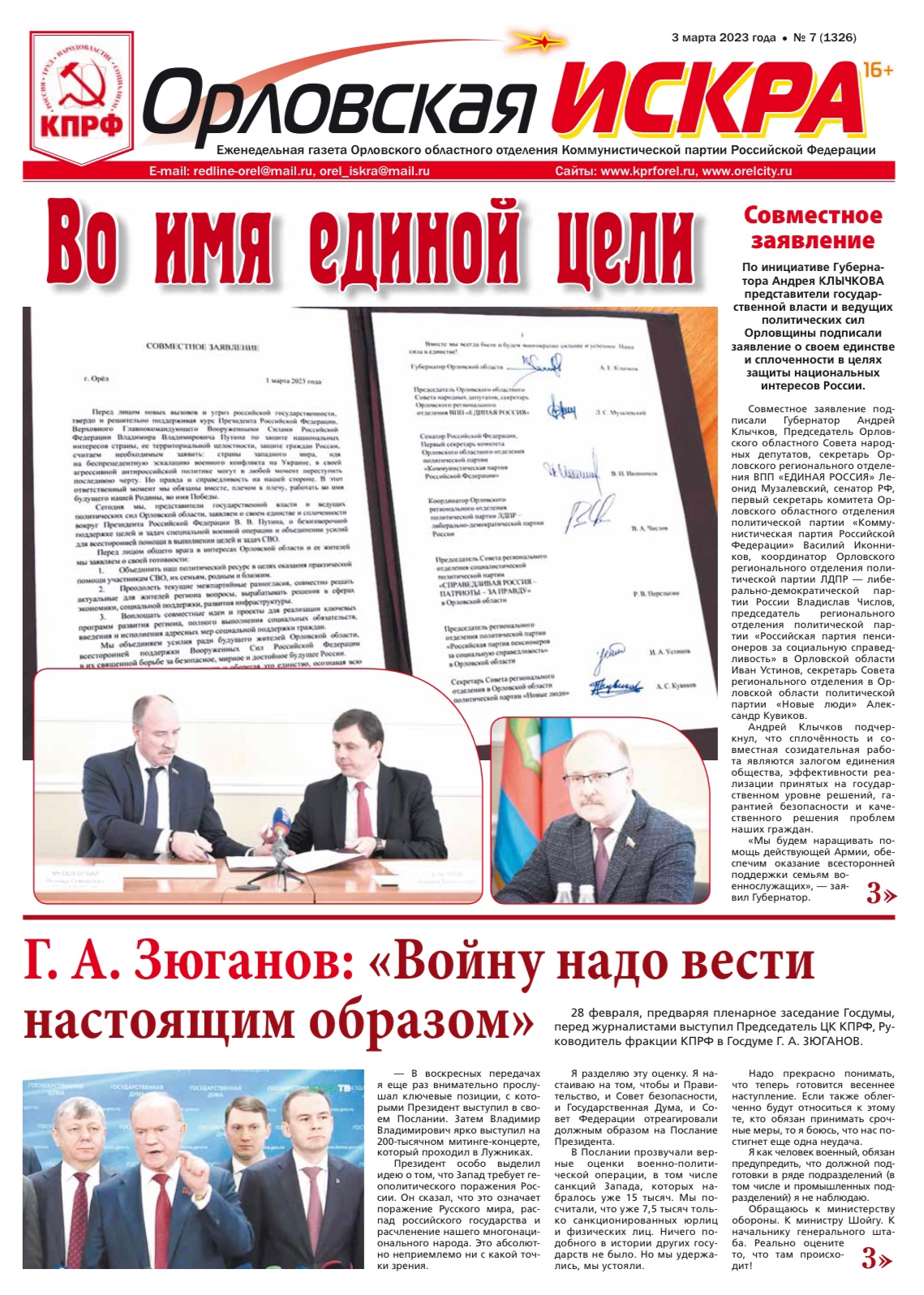 Орловская искра №7 (1326) от 03 марта 2023 года