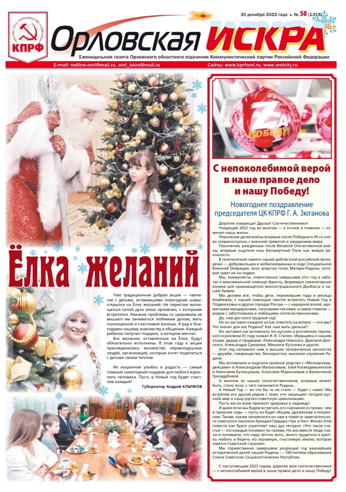 Орловская искра №50 (1319) от 30 декабря 2022 года