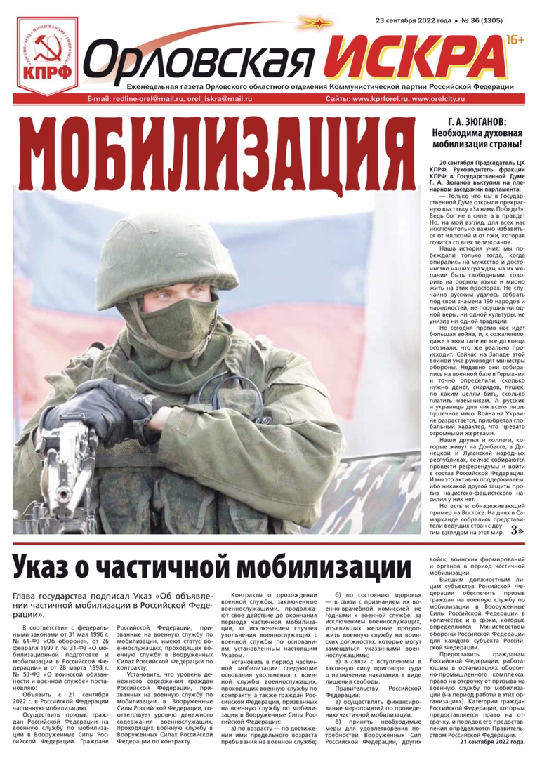 Орловская искра №36 (1305) от 23 сентября 2022 года