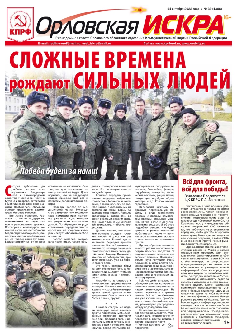 Орловская искра №39 (1308) от 14 октября 2022 года