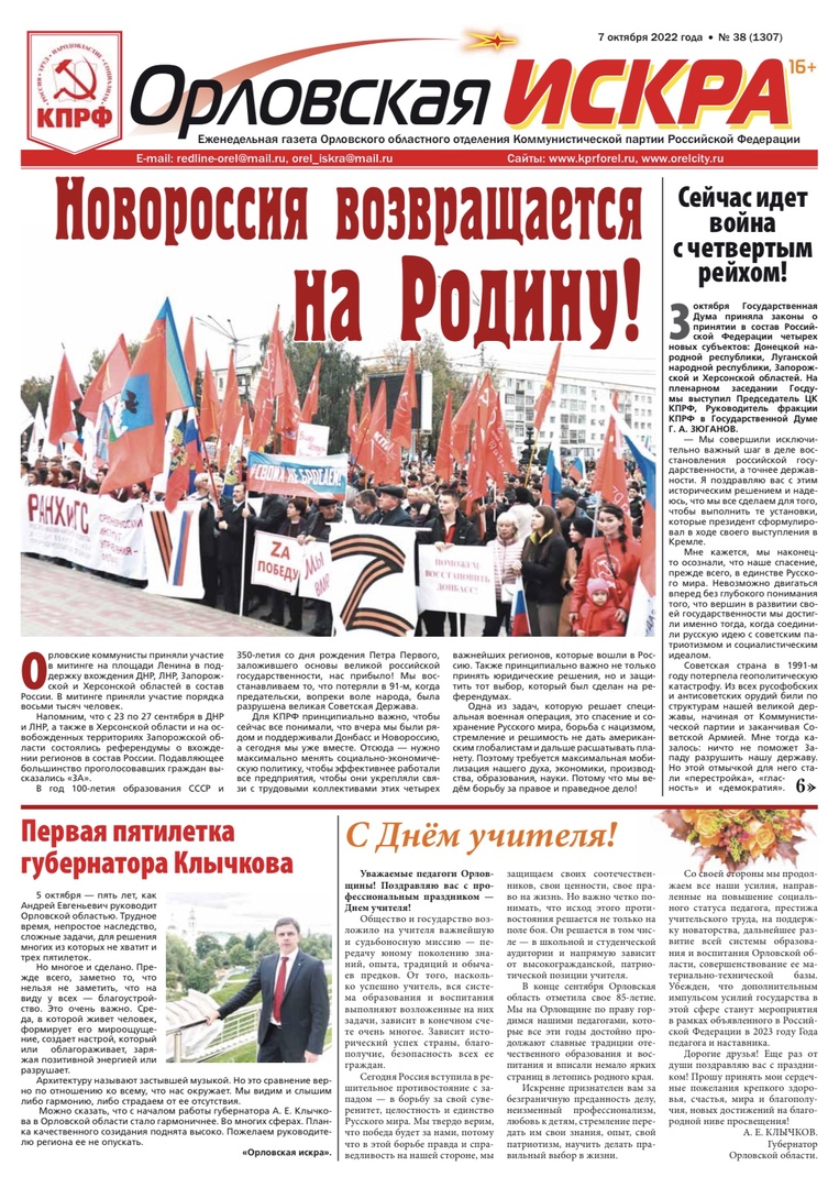 Орловская искра №38 (1307) от 07 октября 2022 года
