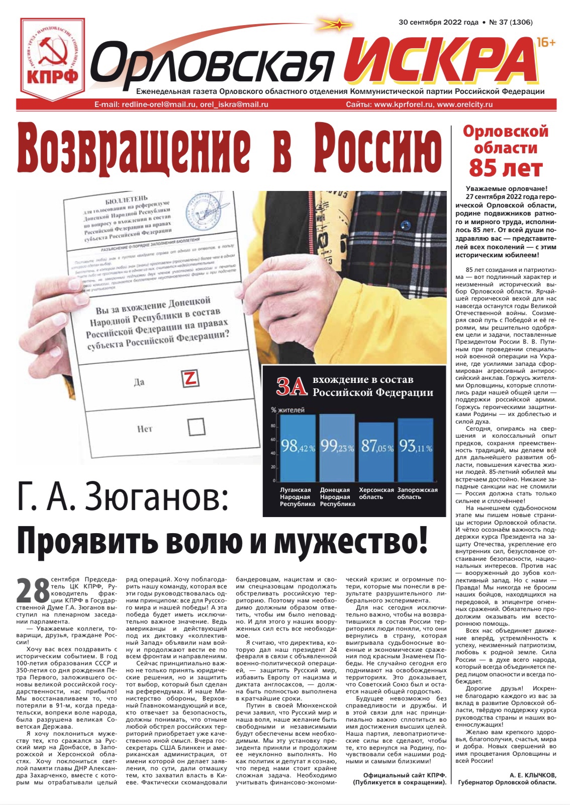 Орловская искра №37 (1306) от 30 сентября 2022 года