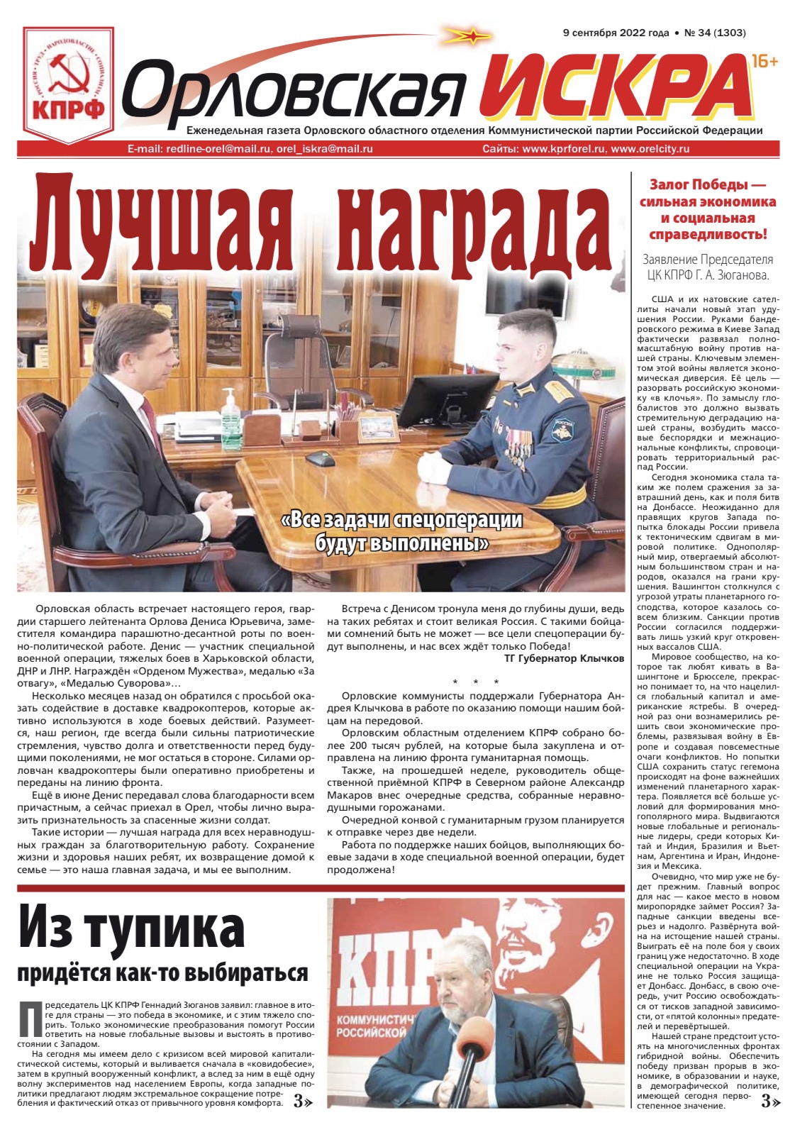 Орловская искра №34 (1303) от 09 сентября 2022 года
