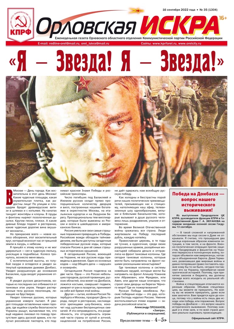 Орловская искра №35 (1304) от 16 сентября 2022 года
