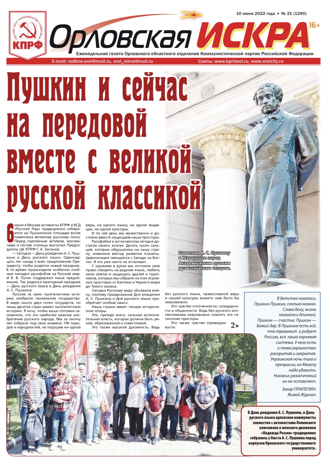 Орловская искра №21 (1290) от 10 июня 2022 года