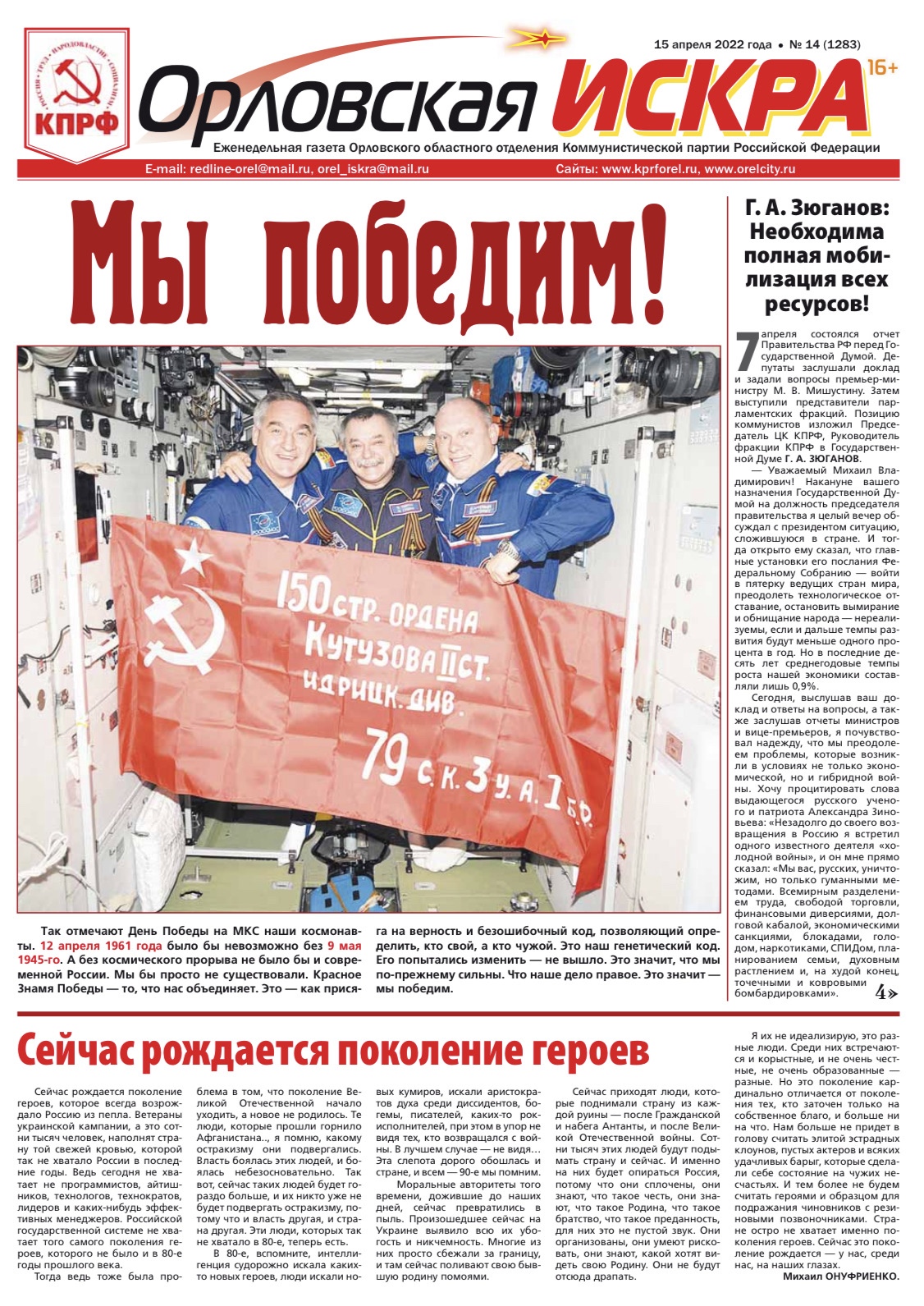 Орловская искра №14 (1283) от 15 апреля 2022 года
