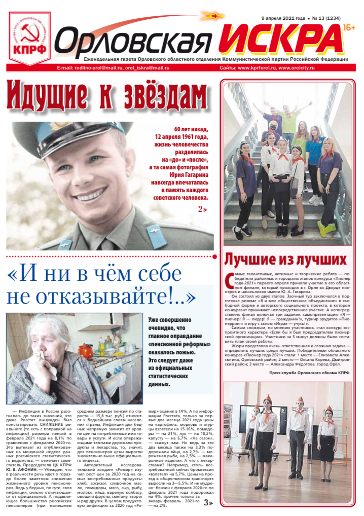 Орловская искра №13 (1134) от 09 апреля 2021 года