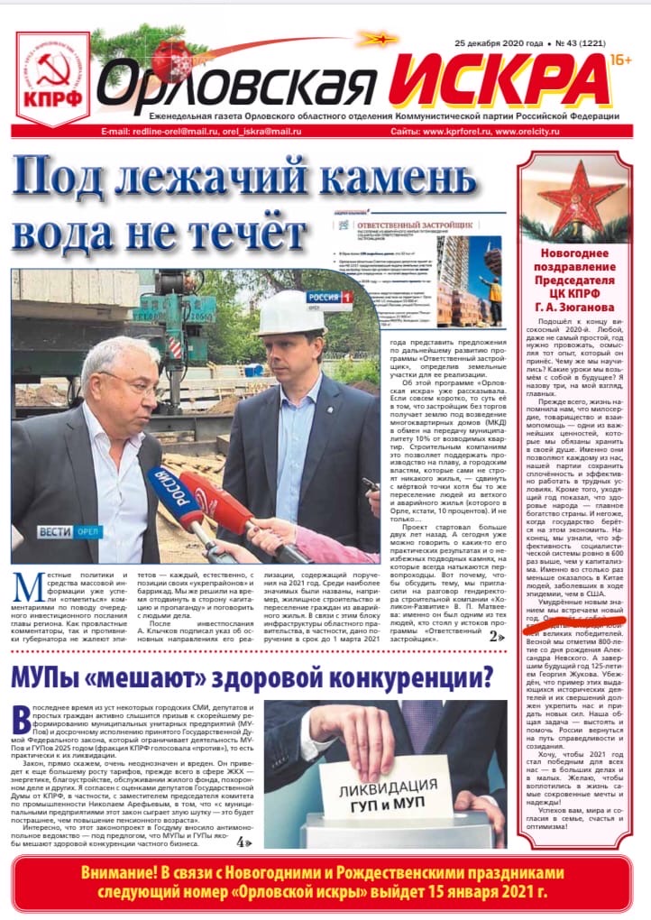 Орловская искра №43 (1221) от 25 декабря 2020 года