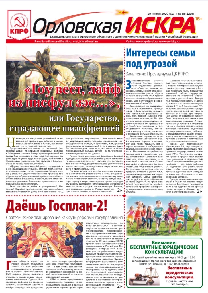 Орловская искра №38 (1216) от 20 ноября 2020 года