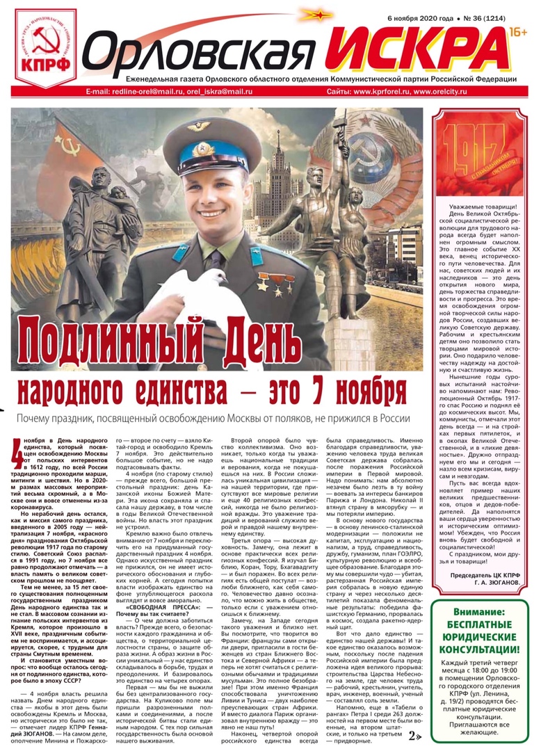 Орловская искра №36 (1214) от 06 ноября 2020 года