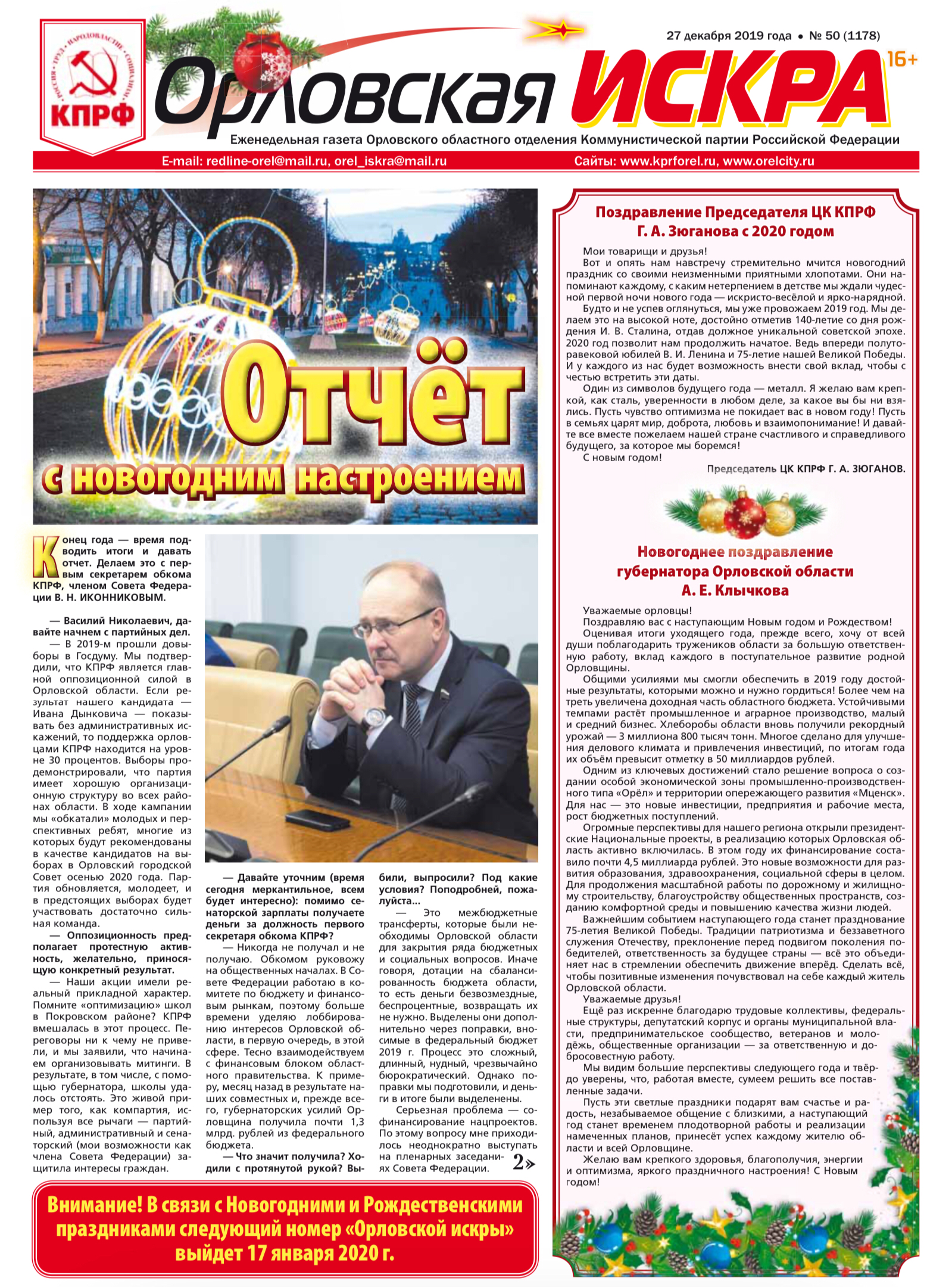 Орловская искра №Свежий выпуск газеты "Орловская искра" N50 (1178) от 27 декабря 2019 года