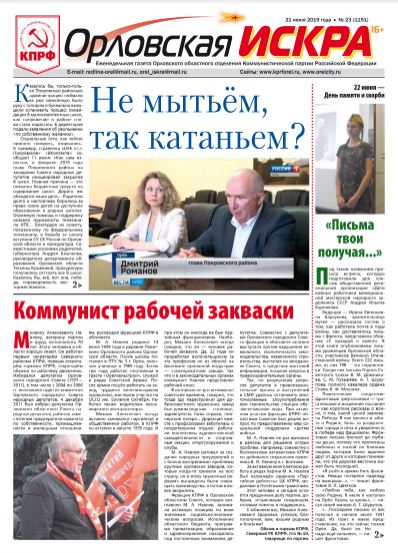Орловская искра №23 от 21 июня 2019 года