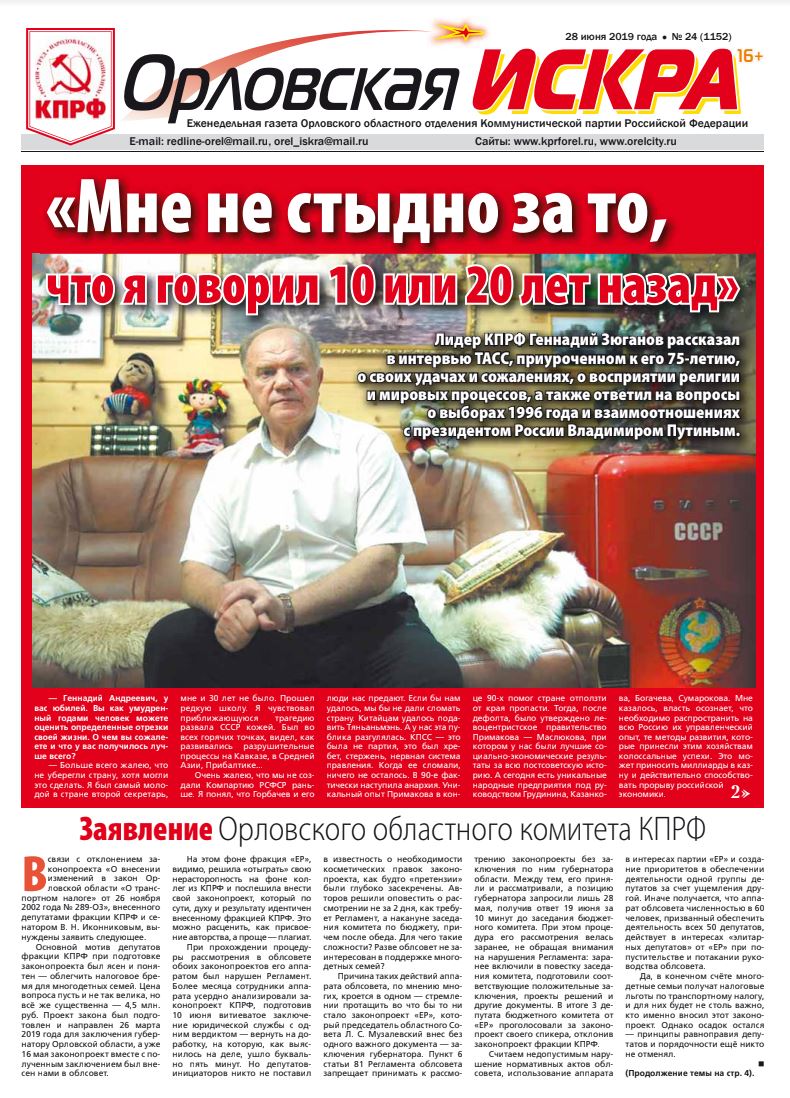 Орловская искра №24 от 28 июня 2019 года