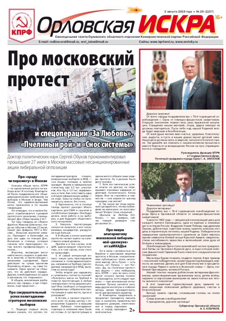 Орловская искра №Свежий выпуск газеты "Орловская искра" N29 (1157) от 02 августа 2019 года