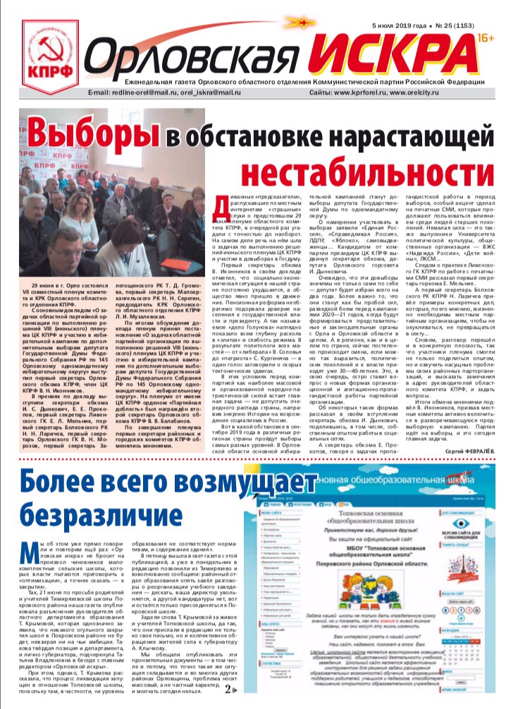Орловская искра №25 Свежий выпуск газеты от 05 июля 2019 года