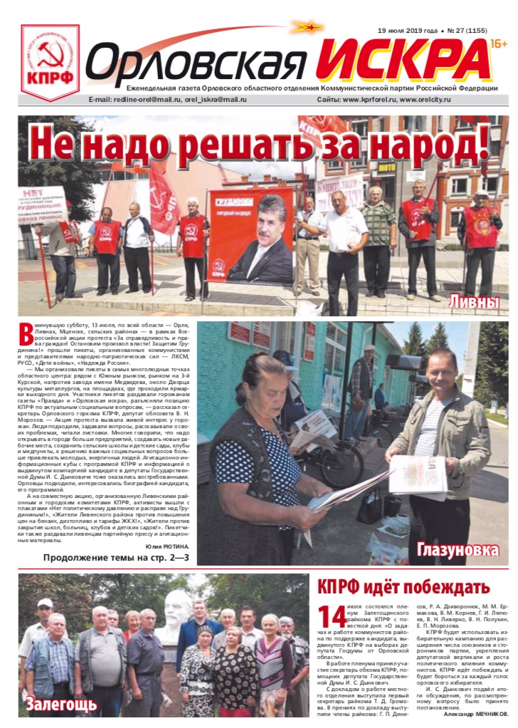 Орловская искра №Свежий выпуск газеты "Орловская искра" N27 (1155). от 19 июля 2019 года