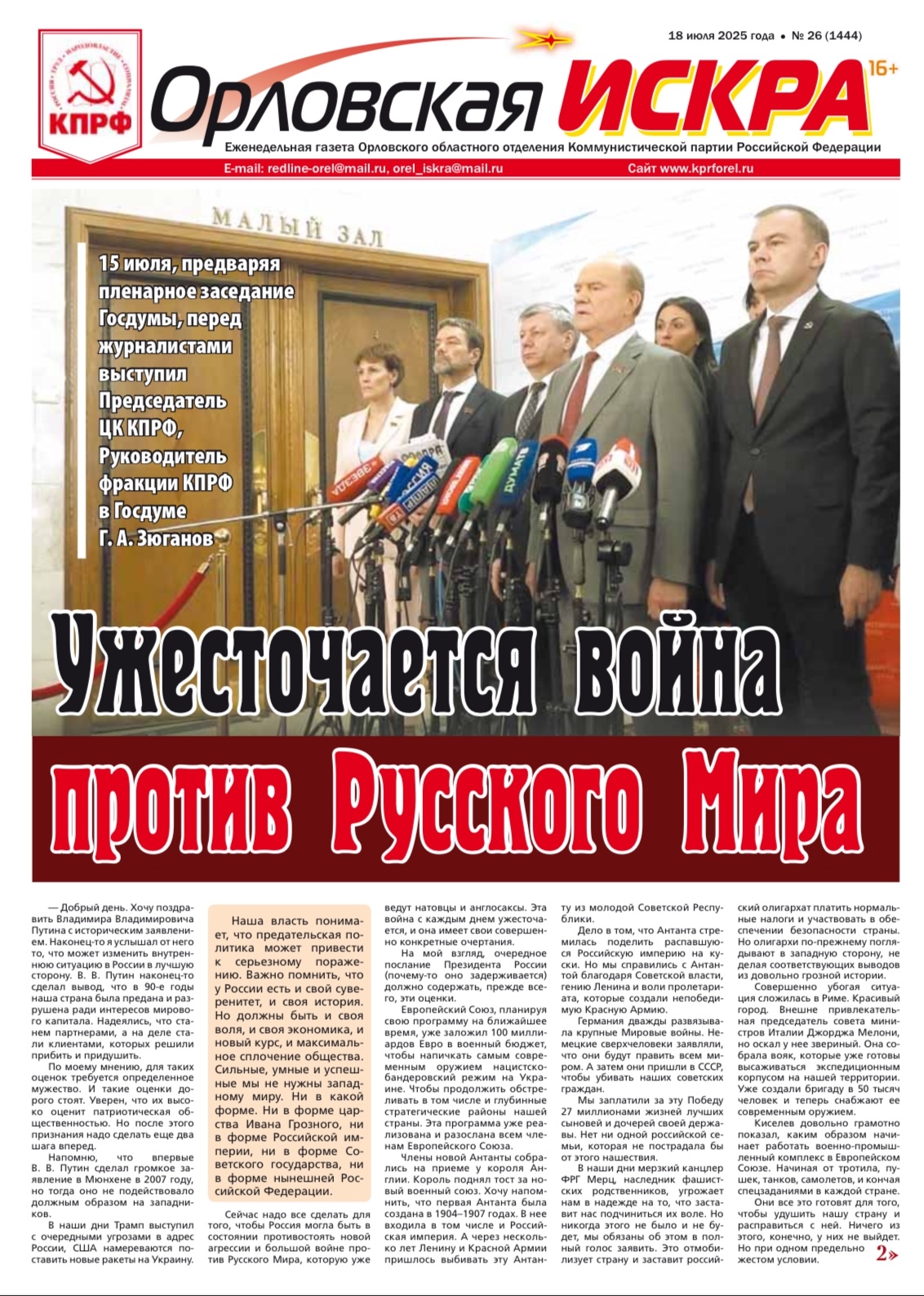 Орловская искра №26 (1344) от 18 июля 2025 года